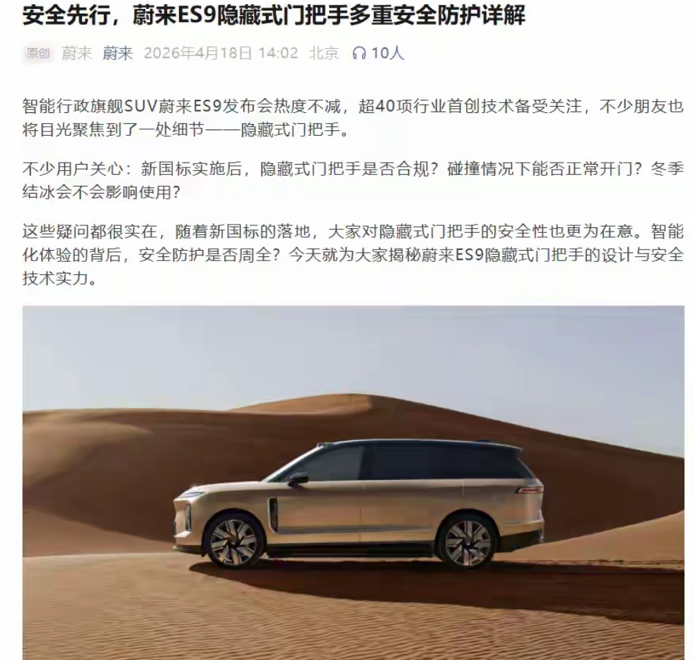 对此,蔚来汽车于2026年4月18日正式发文回应。蔚来官方表示,目前包括ES9在内的全系在售车型均可正常使用隐藏式门把手,且完全符合现行国家标准。